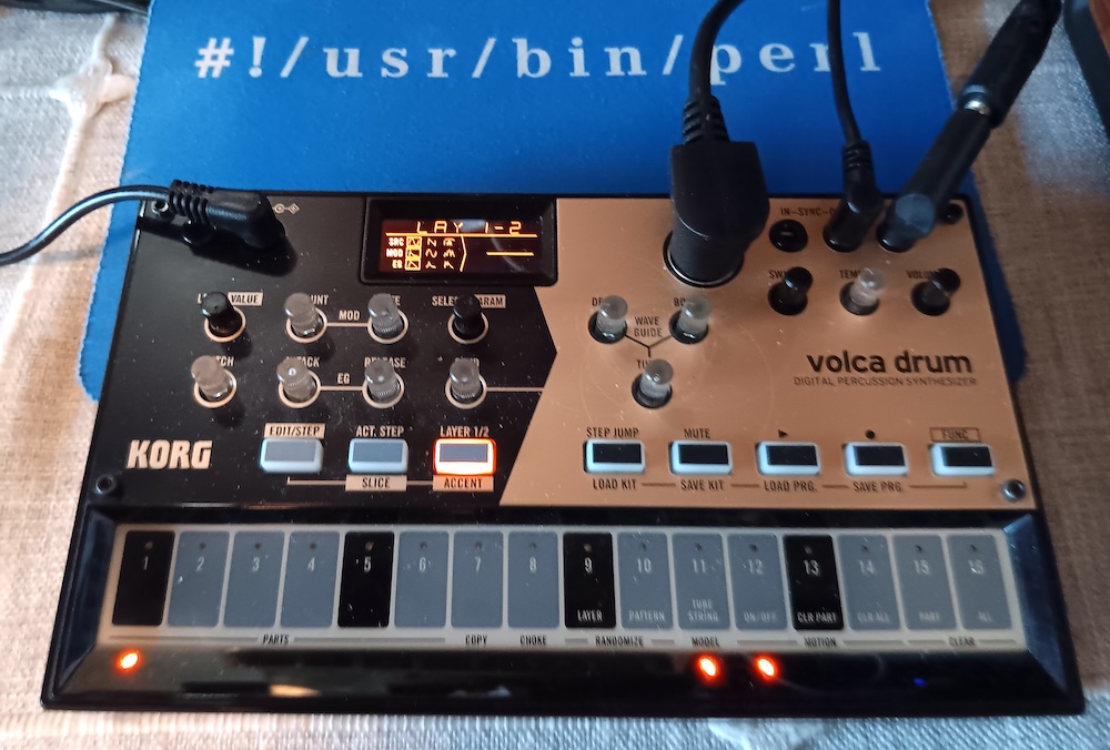 As an example, here is the above code controlling my Volca Drum drum machine on a stock, funky groove. We invoke it on the command-line like this: